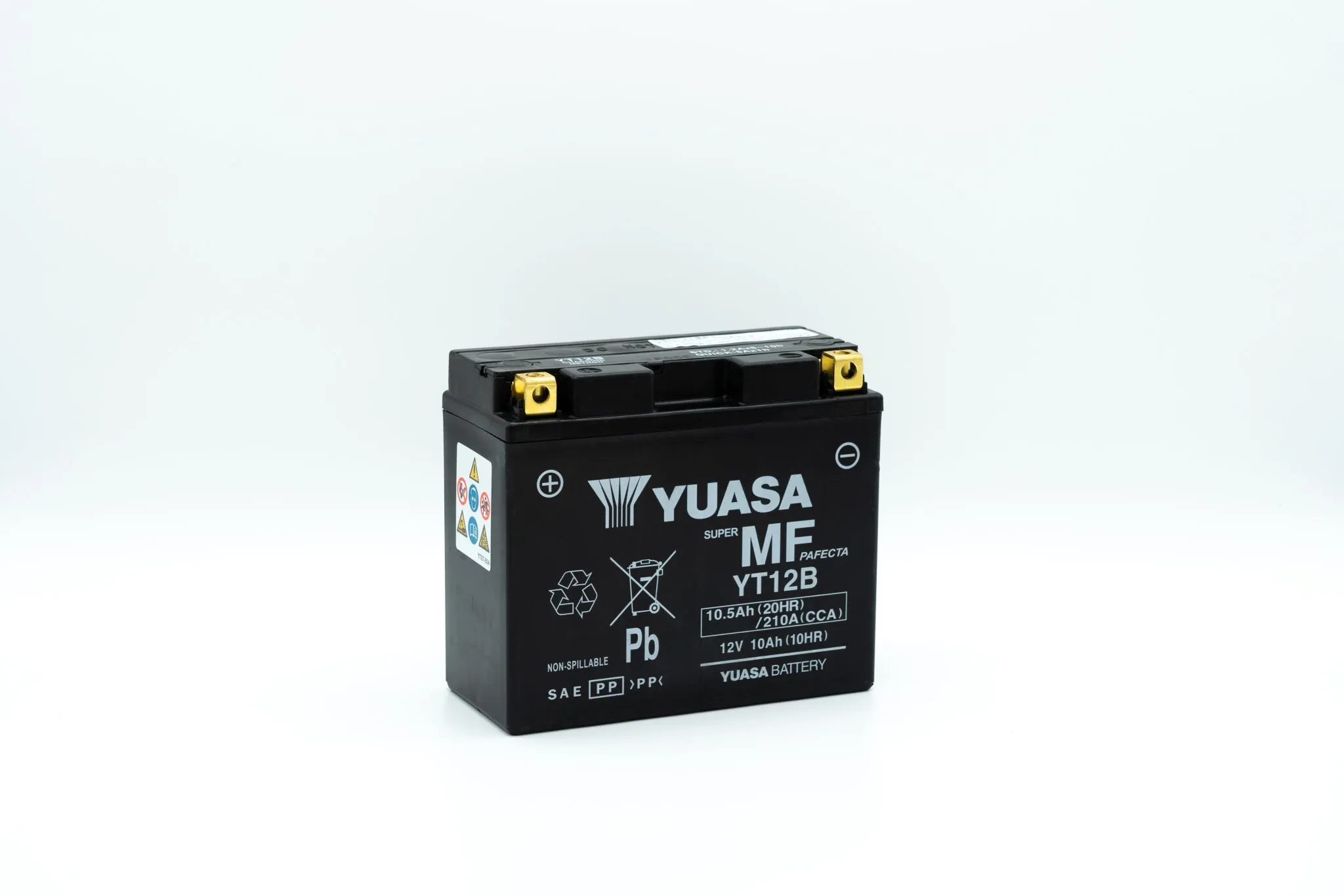 Marca: YUASA Referencia de proveedor: YT12B(WC) Ácido: Activada de fábrica Altura: 130 mm (5-1/8") Ancho: 69 mm (2-3/4") Capacidad de la batería: 10 Ah Carga máxima de la batería: 1 A Color/acabado: Negro Corriente arranque en frío (CCA)/amperios: 210 A Longitud: 150 mm (5-7/8") Modelo: YT N.º referencia: YT12B-BS Nombre de producto: Batería Peso: 4,1 kg (9 lb) Posición de terminal negativo: Derecha Posición de terminal positivo: Izquierda Química de batería: Plomo-ácido Tipo: AGM libre de mantenimiento Unidades: Unidad Voltaje: 12 V