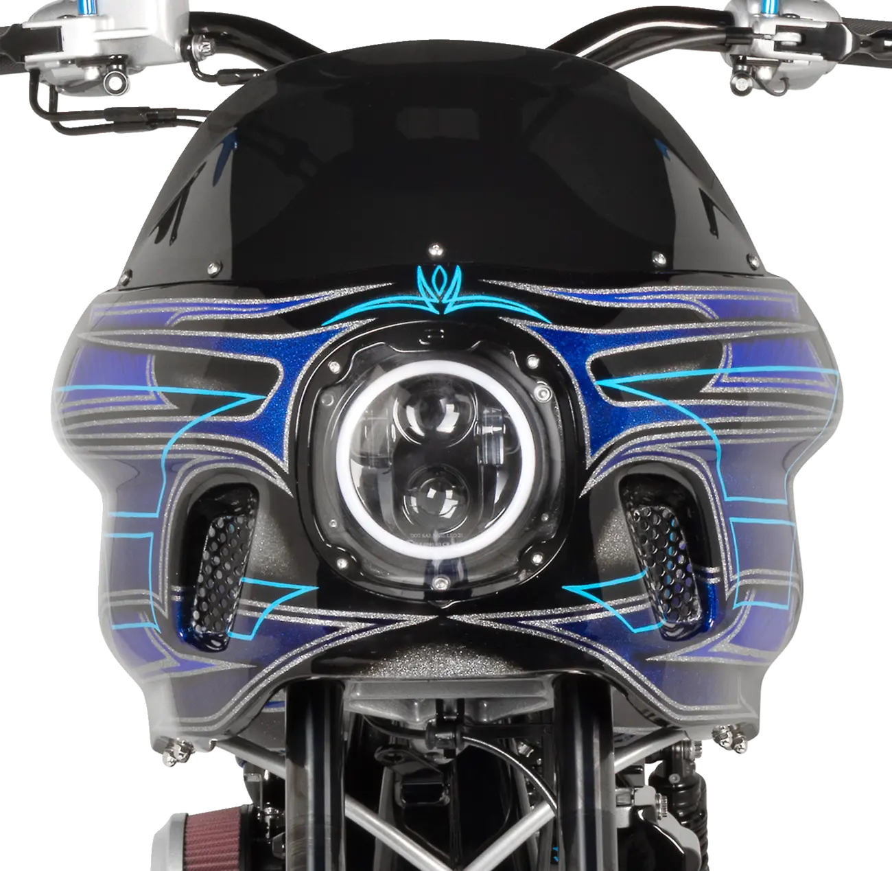 - Incluye protector de faro transparente, parabrisas tintado Light Smoke de 8” de alto, soportes pintados al polvo y herrajes de acero inoxidable.