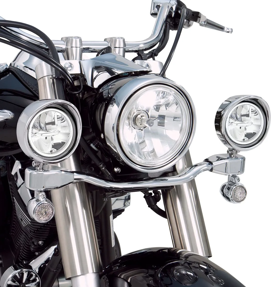 Carcasas de aluminio fundido fijadas permanentemente a la barra de luz elíptica de acero sin soldaduras; el diseño sin soldaduras elimina el riesgo de desprendimiento por vibración Cableado interno para un acabado limpio Incluye luces LED CREE de 3-1/2” con blanco real 6000K Incluye interruptor de encendido/apagado que se puede montar en una tapa lateral Insertos de reubicación de intermitentes permiten reemplazar intermitentes OEM por cualquier luz con perno roscado de 8 mm No incluye adaptador de intermitente ref. 2001-2694 (se vende por separado). Este adaptador tiene un orificio central de 8 mm para intermitentes universales Si los intermitentes aftermarket son LED, se requiere un igualador de carga dual ref. 2050-0044 (se vende por separado) para reducir la frecuencia de parpadeo Algunos modelos de cruiser pueden requerir un divisor de LED indicador individual, ref. 2120-1231