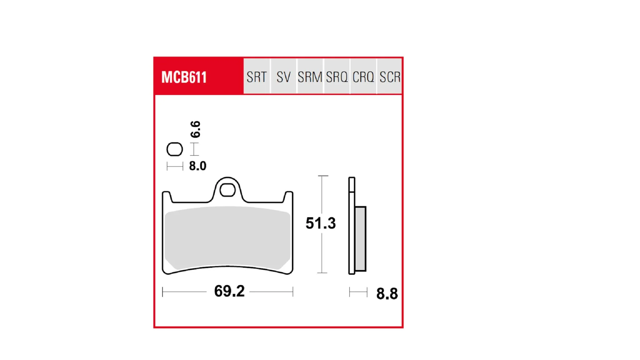 Marca: TRW Referencia de proveedor: MCB611TRQ Ancho: 51,3 mm (2-1/64") Estilo: Circuito Grosor: 8,8 mm (11/32") Longitud: 69,2 mm (2-23/32") Material: Metal sinterizado Nombre de producto: Pastilla de freno Tipo: Metal sinterizado Unidades: Set