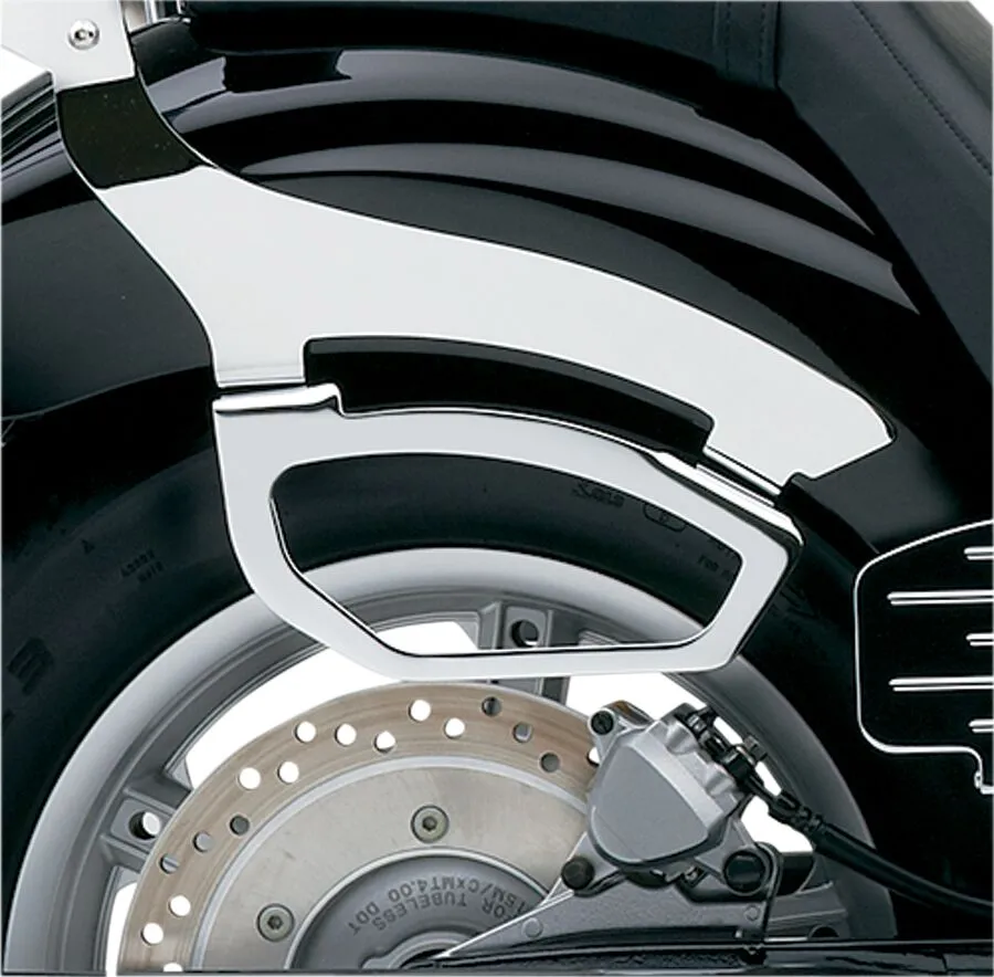 Evita que las alforjas tipo throw-over se enreden en la rueda trasera Se fija a los puntos de montaje existentes para una instalación sencilla; ajuste personalizado para cada moto Fabricado con tubo de acero grueso, doblado para ajustarse a cada modelo de moto, pulido y recubierto con pintura en polvo Elemento de seguridad tanto para el piloto como para las alforjas Fabricado en EE. UU.